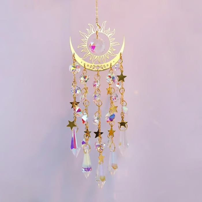 🌈Rainbow Maker: Suncatcher has a lustrous metal frame with sun, moonand stars patterns. Artificial crystals and pendants catchsunlight, creating a dreamy light - shadow effect. ltsunique design, fine craftsmanship and strongdecorativeness make it a captivating art piece.
